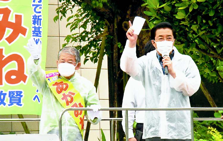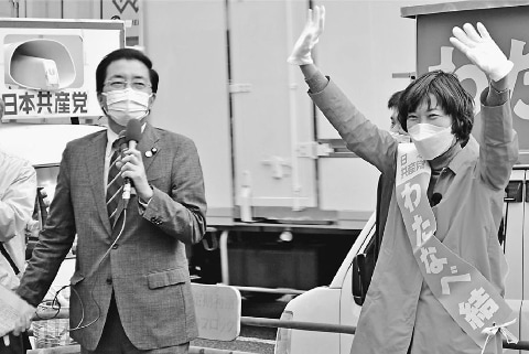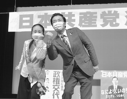 2021年10月20日(写真)訴える山下副委員長(左)と、わたなべ候補=20日、大阪市西成区日本共産党の山下芳生副委員長・参院議員は20日、大阪府内6カ所で街頭演説し、「市民と野…