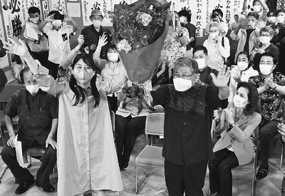 2021年11月1日(写真)沖縄1区で当選確実の報を受け花束を受け取る赤嶺政賢さん=31日、那覇市「民意を無視する政権への怒りが勝利につながった」―衆院沖縄1区「オール沖縄」代…