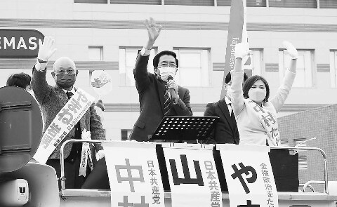 2021年11月11日(写真)中村(右)、やまね(左)両候補とともに訴える山下氏=11日、広島市14日投票の広島県知事選と広島市安佐南区の県議補選で、日本共産党の山下芳生副委員長…