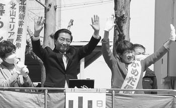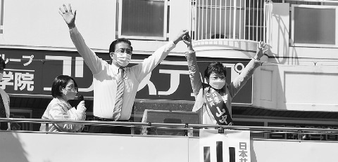 2023年4月1日(写真)声援に応える(前列左から)山下、山中の両氏=1日、大阪市城東区日本共産党の山下芳生副委員長・参院議員は1日、大阪市内5カ所で街頭演説し、山中智子(城…