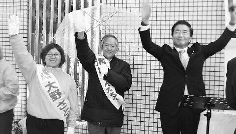 2023年4月7日(写真)激励にこたえる(右から)山下副委員長と溝口、大野の両候補=7日、神戸市中央区日本共産党の山下芳生副委員長は7日夕、神戸市中央区の三宮で溝口しんたろう…
