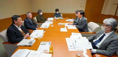 2025年3月4日(写真)懇談する(左手前から)森、米田、村田の各氏らと(右手前から)堤、山下両氏ら=4日、党本部電機・情報ユニオンの森英一書記長ら役員は4日、日本共産党本部…