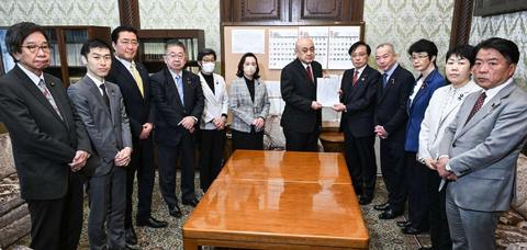 2025年3月11日(写真)小林史武参院事務総長(右から6人目)に企業・団体献金全面禁止法案を提出する井上哲士参院幹事長(右隣)ら党議員団=11日、国会内日本共産党は11日、「…