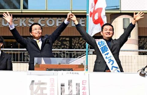 2025年3月22日(写真)声援に応える(左から)山下、さとう両氏=22日、滋賀県草津市日本共産党の山下よしき副委員長・参院議員(比例予定候補)は22日、滋賀県草津市で街頭演説…