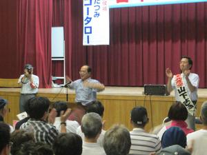 photo☆ 大阪、西淀川区演説会。たつみコータロー・大阪選挙区候補のお父さん、辰巳まさお(元・早稲田大応援団の団長)さん登場!司会の石井みすずさん「『比例は日本共産党、選挙区はたつみコータロー』、「辰巳まさお」は無効」です。(会場、笑)