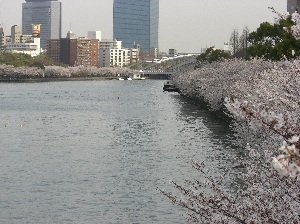 集会を終え、JR大阪環状線で党大阪府委員会事務所に向かう途中、「桜ノ宮」駅手前の鉄橋あたりで、電車の窓からは大川の土手沿いに満開の桜が…。我慢できませんでした。同行のスタッフに断りを入れて途中下車。しばし桜を楽しむことにしました。