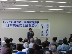 和歌山県橋本市から、南海電車でいったん大阪の新今宮に戻り、JRで奈良県斑鳩(いかるが)町へ。党北和地区主催の「党を語るつどい」です。青年運動の後輩でもある宮本次郎県会予定候補が20分間の演説。いいですね。3年前の前回選挙(生駒郡区)で自民、民主を相手に堂々のたたかいをし、その後、地域にうってでながら生活相談活動を旺盛に展開している若き宮本次郎さん。現在、ニチアス王子工場のアスベスト被害者の救済活動を通じ、県内若手弁護士グループとも交流を深めています。なんとしても県会へ送りたいものです。ここも会場一杯の参加者で、熱気あるつどいとなりました。