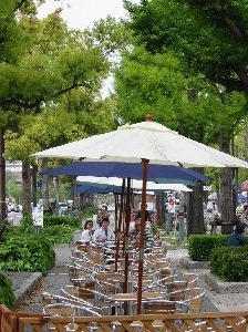 1000人の参加者で大成功の「たんぽぽ祭り」会場をあとに、JR網干駅から姫路駅へ。午後は、党姫路女性後援会の総会です。少し時間があったので姫路市内を散策。写真は、姫路駅前のメインストリート大手前通りのオープンカフェ。外国人観光客の姿もありました。