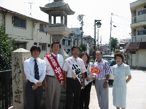 午前中は、小松ひさし府会予定候補、おち妙子、谷沢ちか子、内藤こういちの各市議とともに3カ所で街頭演説。それぞれの場所に支持者の方が集まってくれました。暑いのに感激です。(写真は、東久宝寺を流れる長瀬川のほとりで。ナント、縦じまシャツの自民党市議から差し入れをもらいました)