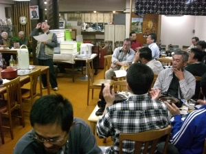 大山寺の旅館で鳥取大学ワンダーフォーゲル部のOB会。3月、鳥取での演説会にたくさんのOBを誘って参加してくださり、直後に急逝されたH先輩を偲び、皆で山の歌を合唱。