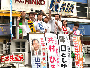 宣伝カーのうえで待ち構える瀬戸恵子(比例)、味口としゆき(兵庫1区)、井村ひろ子(兵庫2区)の各衆院候補。遅れて駆けつける金田みねお(比例・兵庫3区)候補。みんな「いよいよ決戦のときが来た」って感じでいい顔してます。司会は堀内照文・参院兵庫選挙区候補。