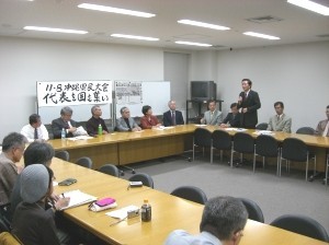 沖縄の“うねり”を感じました。夕方、国会内で開かれた「11・8沖縄県民大会代表を囲むつどい」に参加。沖縄から上京された5人の方のお話を聞きました。こくた、井上、宮本議員と。